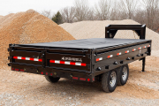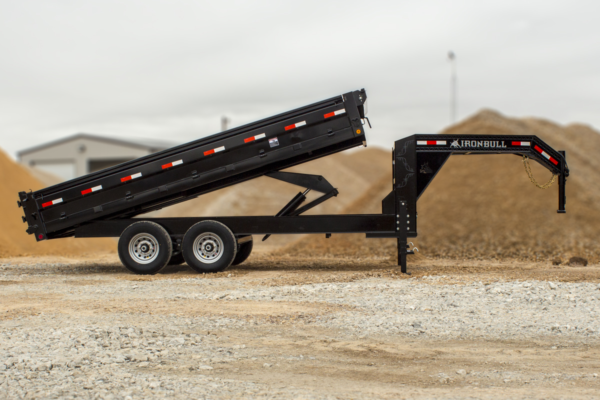 Versitility is the name of the game with the Iron Bull DDG Gooseneck Deckover Dump trailer. Our deckover dumps offer a raised deck (above the tires) to accommodate 10 gauge fold down sides and a bed width of 96”. Available in gooseneck or bumper pull models, each deckover is equipped standard with 10” I beam frame and neck with a 12” riser on gooseneck models. 3” channel crossmembers span the 10 gauge smooth steel floor. 2 5/16” couplers are equipped standard on each model with a 7k drop leg jack and locking pump box to secure the trailer components. A standard scissor hoist with 520 cylinder and KTI hydraulic pump lift this unit to a near 45 degree dump angle and the retractable tarp system ensures your cargo will stay in your load and off the road. Three way gate functionality give you the flexibility to have a spreader gate, barn door gate, or truck style tail gate on your trailer. Every Iron Bull trailer is equipped with Dexter running gear and radial tires for a smooth, dependable ride and every trailer is backed by our industry best IronClad warranty providing 3 years structural, 2 years comprehensive components, and 2 years free roadside assistance that extends to the tow vehicle.